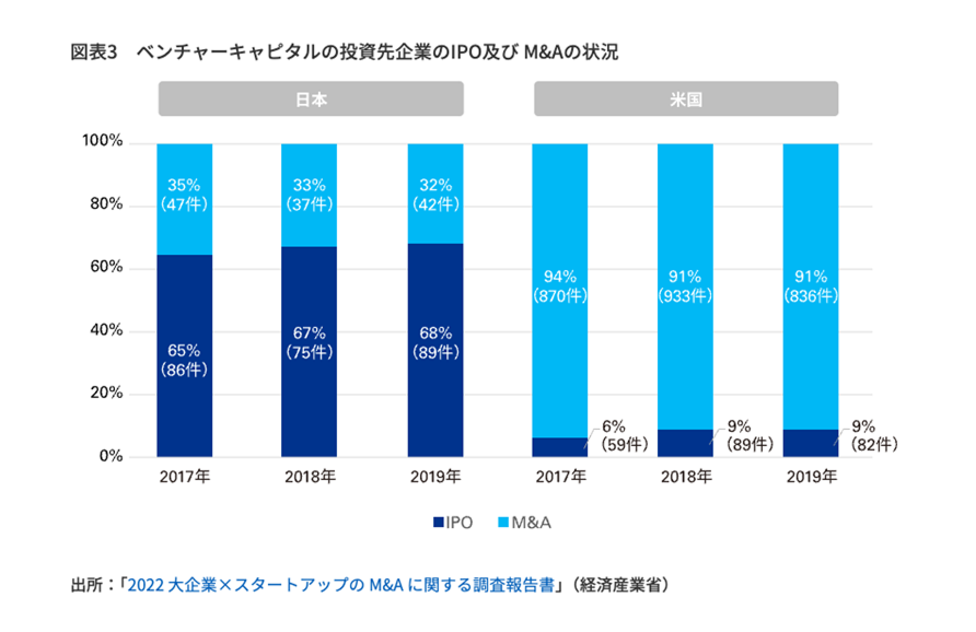 資金調達環境が改善される一方、資金調達したスタートアップは投資家への出口を作る必要があります。その代表的なものが「株式上場(IPO)」となります。 2014年、投資を受ける会社が1,000社を超えましたが、2014年のIPO数は45社(VCから資金調達をしていない企業も含めると79社)、それ以降も50社前後(IPO全体では90社前後)を推移しています。また、もう一つの出口となるM&Aに関しては、2019年で42件と一定数はありますが、スタートアップ先進国の米国と比べると20分の1程度と少ない状況にあります(あずさ監査法人調査)。 つまり、日本政府の期待や後押しもあり、スタートアップ数は増加傾向にありますが、出口は限られているというのが今の日本のスタートアップの現状です。