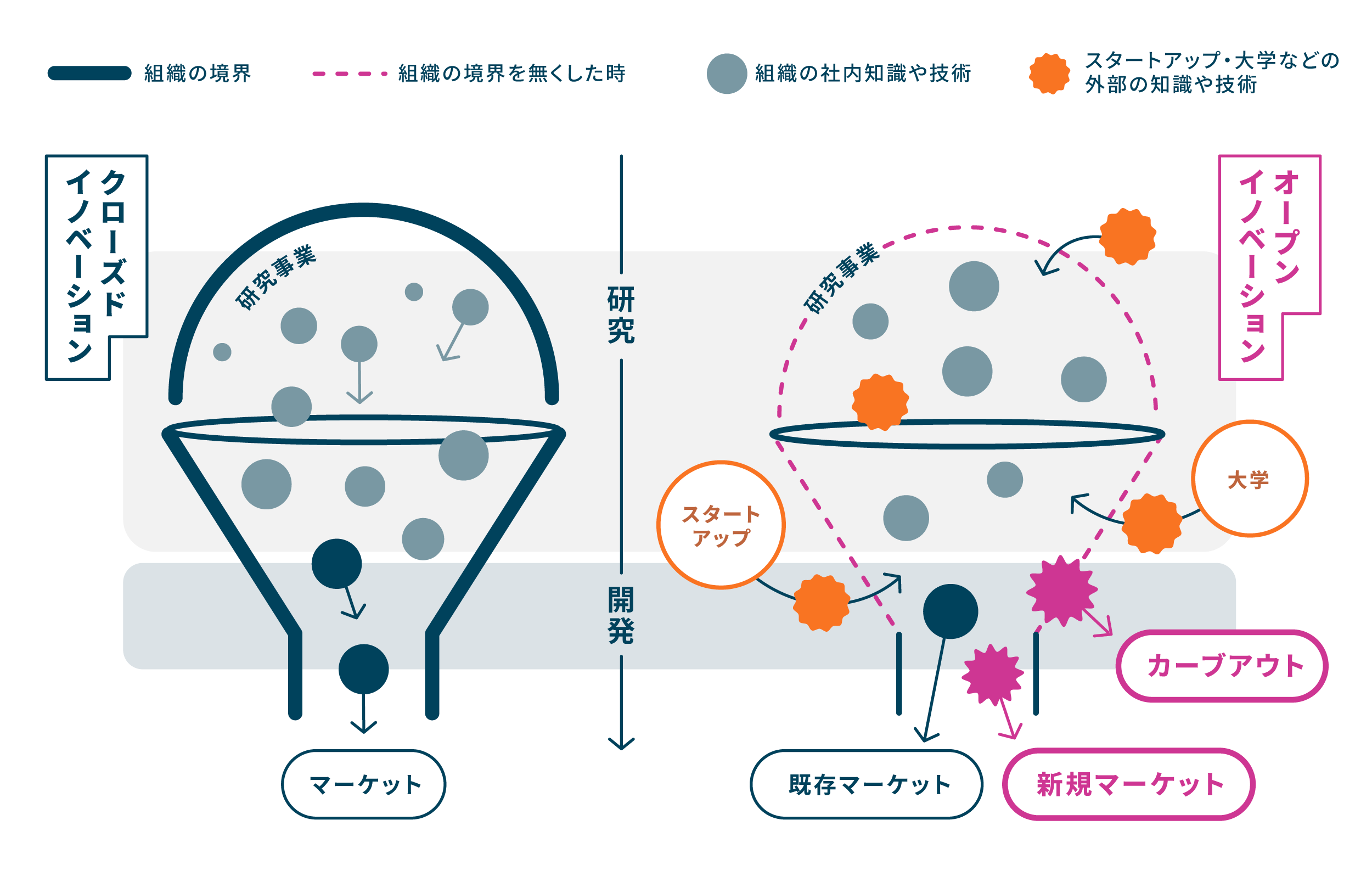 「組織内部のイノベーションを促進するための概念として、意図的かつ積極的に内部と外部の技術やアイデアなどの資源を活用することで、組織内で創出したイノベーションを組織外に展開する市場機会を増やすこと」