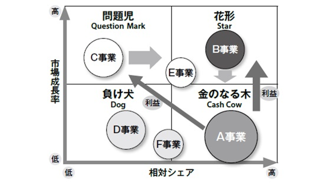 「プロダクト・ポートフォリオ」という考え方は、1970年代にボストン・コンサルティング・グループが企業の多角化戦略を支援するために提唱しました。自社の製品やサービスを市場シェアと市場成長率の2軸で分類し、リソースの配分を最適化する手法です。基本的には、安定して利益を生む「カネのなる木」で得た利益を「花形」や「問題児」に投資し、次の主力事業を育てることを目的としています。
