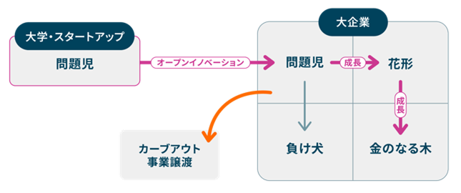 従来は、新規事業となる「問題児」を社内のみで育成することが一般的でした。しかし、外部環境や技術の変化が激しい現在では、社内のリソースだけで創出・育成が難しくなり、外部からの取り込みが有効な手段となりつつあります。