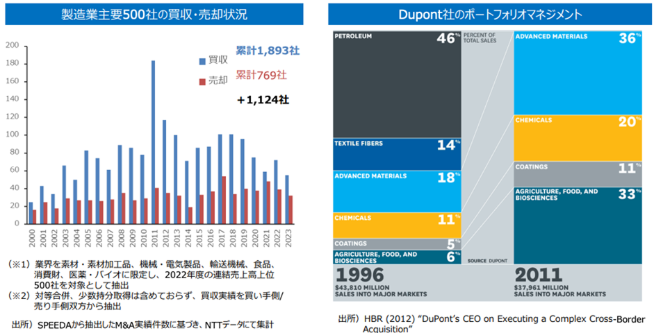 レポートによると、日本の主要製造業500社は買収には積極的ですが、売却件数はその半分以下にとどまっています。一方、Dupont社の事業ポートフォリオを見ると、1996年には石油事業が売上の中心でしたが、2011年には石油事業を完全に手放し、先端材料や農業・バイオサイエンスが主力へと成長しています。わずか15年で大きく事業領域を転換したのです。