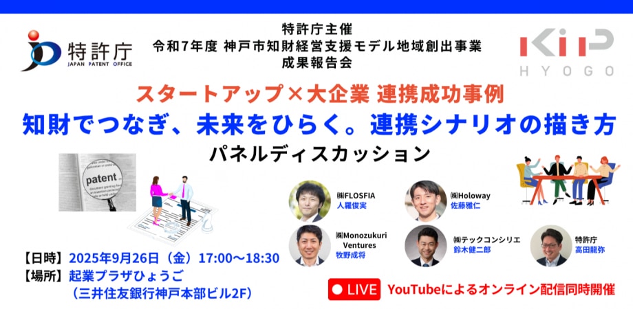 弊社CEO 牧野が「特許庁主催パネルディスカッション スタートアップ×大企業 連携成功事例 ― 知財でつなぎ、未来をひらく。連携シナリオの描き方」に登壇します。