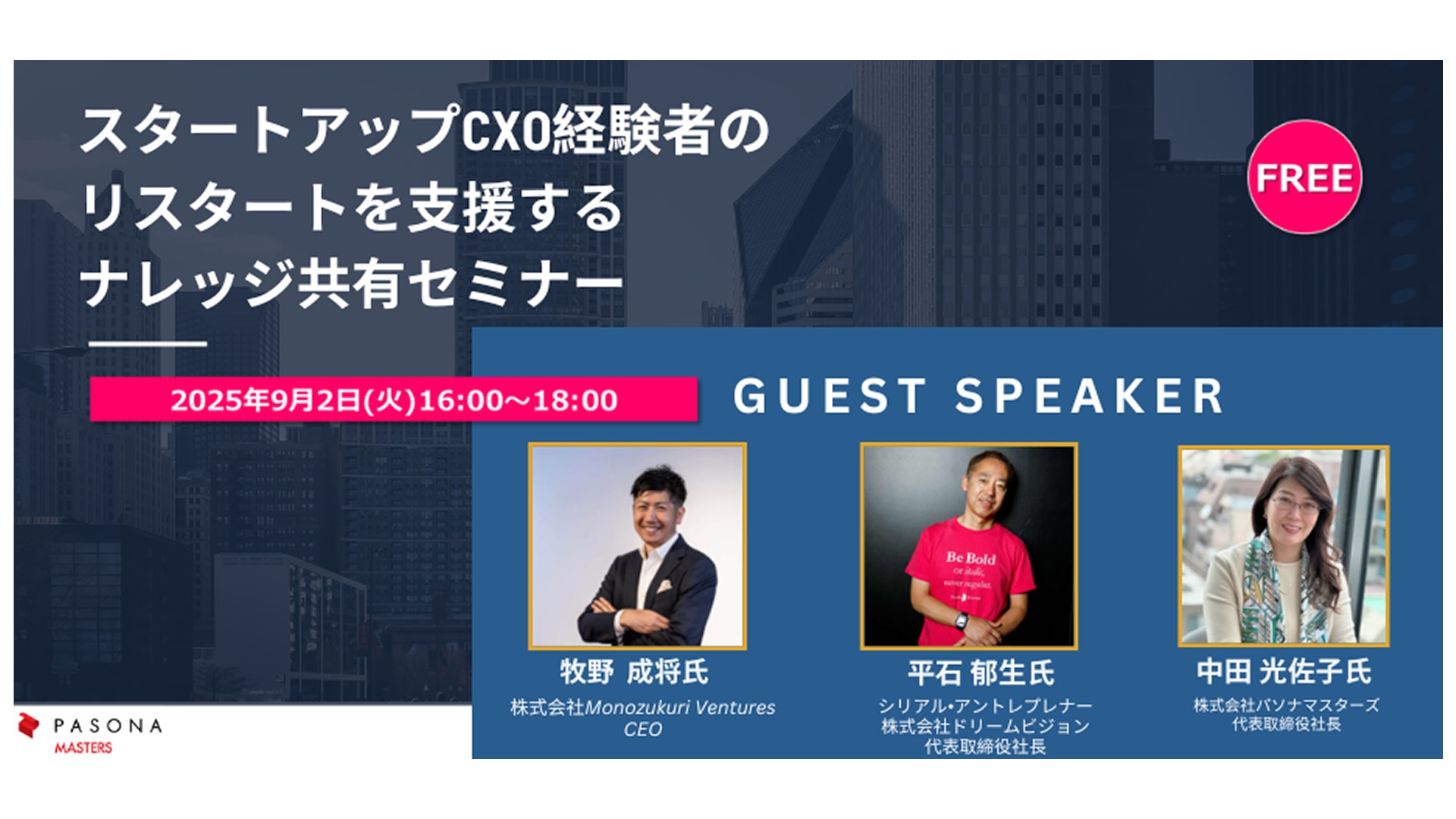 2025年9月2日(火)、東京都港区のPASONA SQUARE 16階にて、株式会社パソナマスターズ主催のイベント「スタートアップCxOの『リスタート』をどう活かすか」が開催されました。